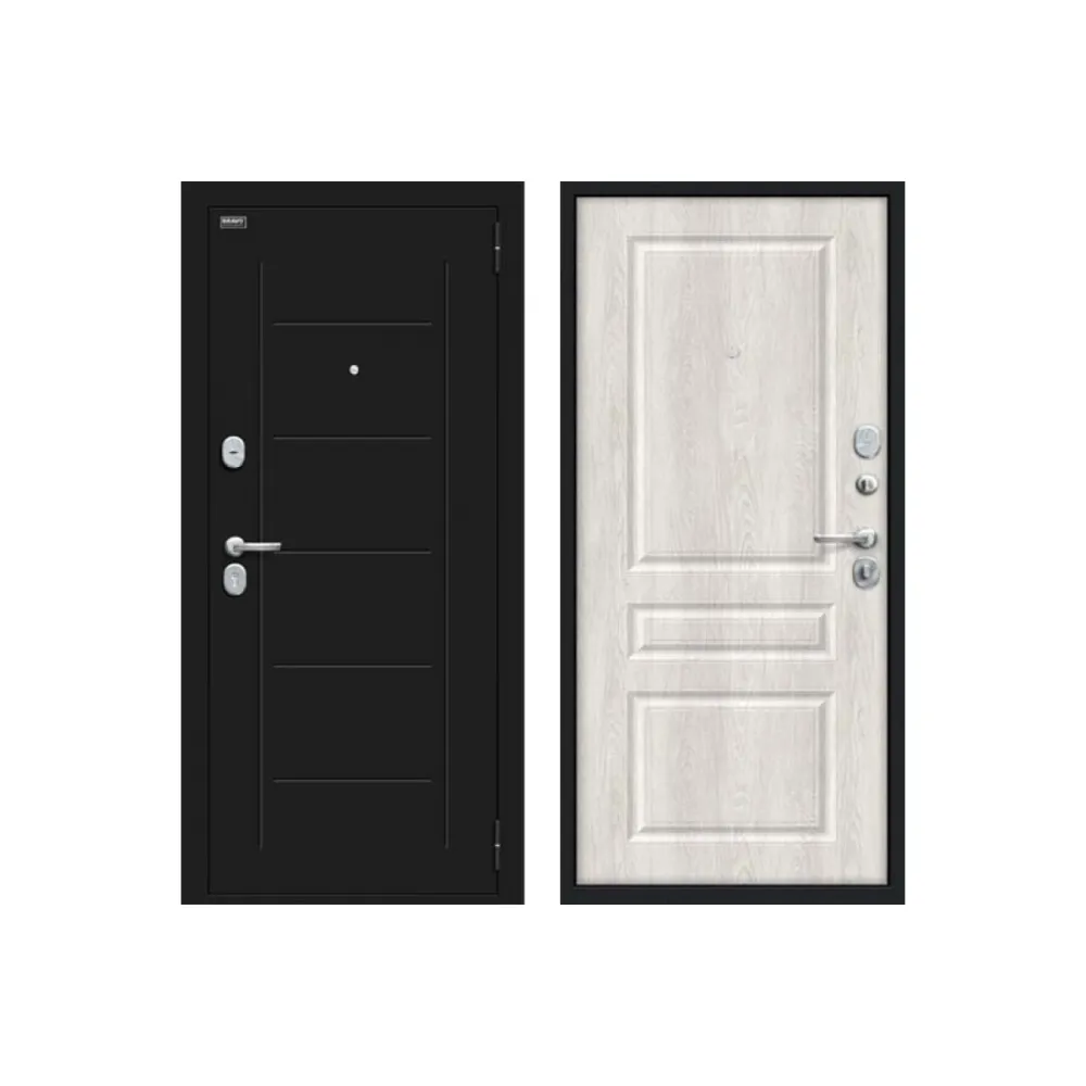 Четыре вертикально-горизонтальных усиливающих омега-профиля (ребра) создают единую монолитную жесткость и прочность конструкции. Сверхпрочная конструкция «6x2» — двойная толщина стали профиля полотна, двух контуров коробки, в зонах замка и петель. Дополнительную стойкость ко взлому обеспечивают два противосъемных штыря.